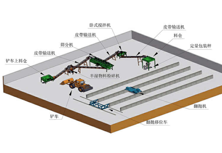 粉狀有機(jī)肥生產(chǎn)線上使用的設(shè)備包括翻拋機(jī)、滾筒篩選機(jī)、帶式輸送機(jī)、臥式混合機(jī)、粉碎機(jī)等。與顆粒有機(jī)肥生產(chǎn)線相比,該生產(chǎn)線造粒、干燥、冷卻等工序較少,工藝相對(duì)簡(jiǎn)單。