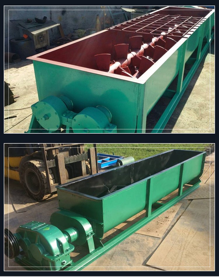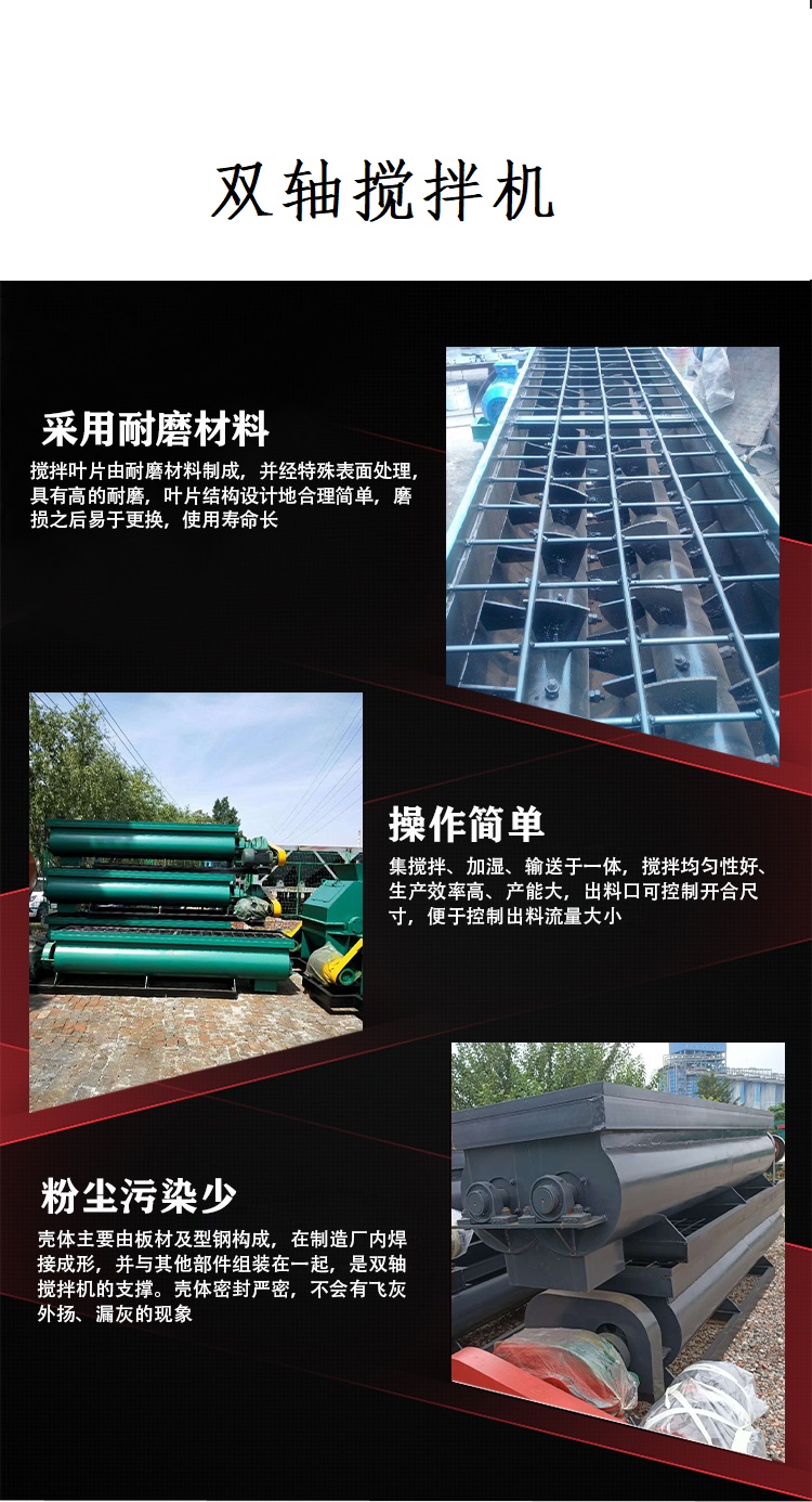 雙軸攪拌機(jī)利用兩根呈對(duì)稱狀的螺旋軸的同步旋轉(zhuǎn),在輸送干灰等粉狀物料的同時(shí)加水?dāng)嚢,均勻加濕干灰粉狀物料,達(dá)到使加濕物料不冒干灰又不會(huì)滲出水滴的目的,從而便于加濕灰裝車運(yùn)輸或轉(zhuǎn)入其它輸送設(shè)備。