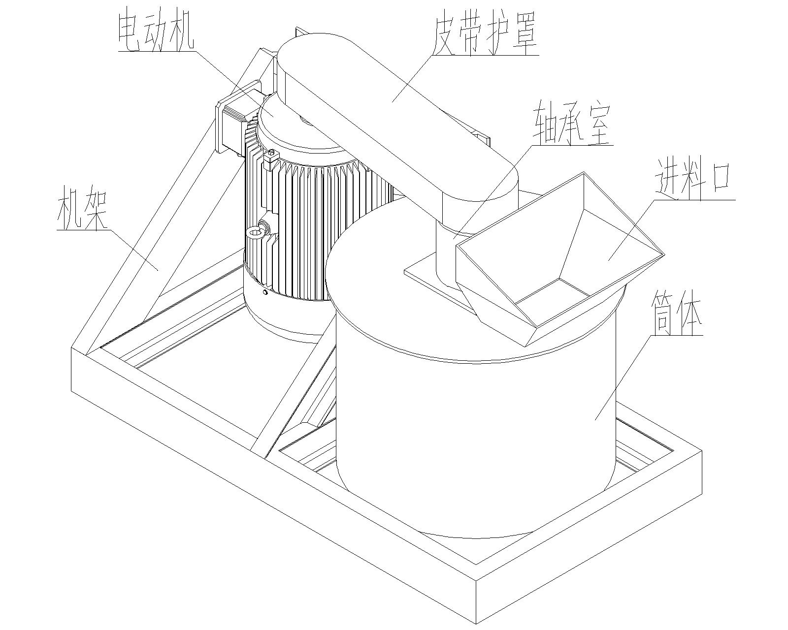 構(gòu)造組成:結(jié)構(gòu)由下機(jī)架、機(jī)殼、上下軸座、主軸、轉(zhuǎn)子盤、鏈條、錘頭、皮帶輪、電機(jī)架等部份組成。動力經(jīng)三角帶帶動主軸旋轉(zhuǎn),主軸有上下兩個軸承座,軸承座安裝在機(jī)殼的上端和下端。機(jī)殼總成安裝在下機(jī)架上,主軸上裝有轉(zhuǎn)子盤和鏈條,加料斗裝在機(jī)殼上部,為了裝卸錘頭方便,機(jī)殼上開有活門,便于拆裝維修。
